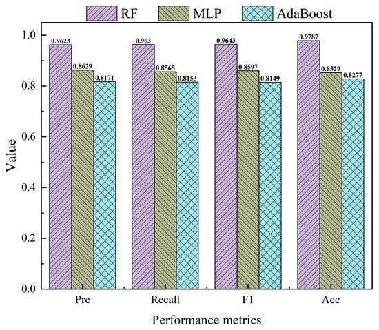 In conjunction with Figure 20, the following information was available: Among the three ML classification methods, the RF algorithm exhibited superior performance in terms of accuracy, precision, recall, and F1 values, achieving scores of 0.9787, 0.9623, 0.9630, and 0.9643, respectively. It was subsequently followed by MLP, while AdaBoost demonstrated comparatively weaker performance. By evaluating the performance of these algorithms across three categorization outcomes (as shown in Figure 21), it can be concluded that the RF algorithm consistently outperformed its counterparts. It is noteworthy that the RF model had optimal performance, especially in the identification of medium and high instability risks. This is vital for application to realistic working conditions. The findings indicated that for the dataset that we employed, the RF algorithm was deemed most suitable. That is, the risk of instability of fissured sandstone predicted by the RF model was the most reliable.