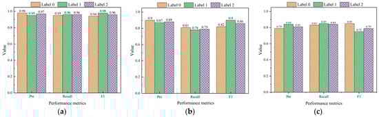Performance metrics of the fissured sandstone instability risk identification models under different instability risks. (a) Random Forest. (b) MLP. (c) AdaBoost.