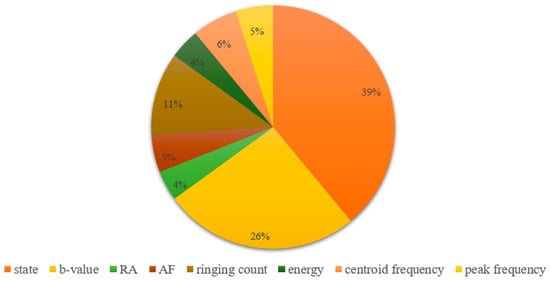 The significance of the eight selected parameters for identifying instability risk states in fissured sandstone is demonstrated in Figure 22. Among these parameters, state and b value exhibited the highest contribution to the identification results, followed by AF and RA. Ringing count, energy, peak frequency, and centroid frequency contributed to a similar extent at approximately 5%. This result was consistent with the analysis of the data distribution and again justified the selection of features in this study. Notably, the combined influence of state and b value exceeded 60% on the classification outcomes. Therefore, state and b value were considered primary criteria in the model for identifying instability risk in fissured sandstone.