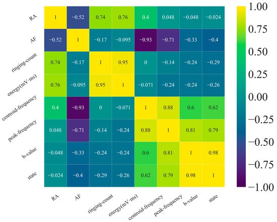 The Spearman correlation coefficient was computed for the eight parameters utilized as inputs in the machine learning models. A heat map, depicted in Figure 23, was generated to visualize these correlations. The Spearman correlation coefficient ranged from −1 to 1, with values closer to 0 indicating weaker associations between the parameters. Positive correlations were observed when the coefficient exceeded 0, while negative correlations were observed when it fell below 0. Correlations with coefficients less than 0.05 were considered statistically insignificant. As the parameters were pairwise calculated for their Spearman correlation coefficients and exhibited positive self-correlation, the resulting heat map represents a symmetric matrix with a diagonal of unity. For example, the final column of the matrix displayed the correlation between the state and the remaining parameters. It was observed that state was nearly no correlation with RA value, a weak negative correlation with ringing count and energy (mV·ms), a moderate negative correlation with AF, and a strong positive correlation with centroid frequency, peak frequency, and b value.