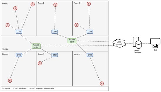 General structure of the communication between the BMS hardware devices in a building plan consisting of six rooms. The red circles indicate IoT devices such as sensors, the blue boxes are control units which connect to the sensors and receive the sensing data, and the green boxes are access points which forward data from CTUs to the BMS.