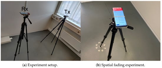 Experimental setup of RSSI measurements using two mobile phones. (a) Shows the equipment used for all measurements, and (b) shows the additional measurement locations for the transmitter to counteract the spatial fading.