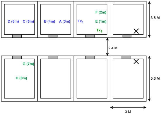 Building plan used for the measurement campaign as well as the tests. Tx1 and Tx2 depict the transmitter locations for the measurement campaign with the coloured letters depicting the receiver locations for the respective transmitter locations. The two Xs indicate the locations of the CTUs repeated in each room.