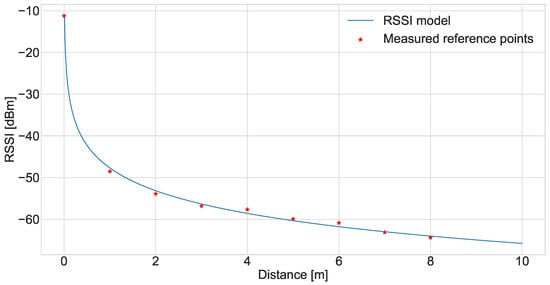 The parameters, , , and , of the RSSI model are found through maximisation of the coefficient of determination when fitting the RSSI model to the data points. In order to do this, the distance and number of walls between the transmitter and receiver are linked to each RSSI measurement. The distance is taken based on the direct path between the transmitter and receiver and the number of walls is counted based on them intersecting with this same path. The parameters which resulted in the largest value are shown in Table 1. These values resulted in an value of 0.9986, which indicates a strong fit with the measured data, as also shown in Figure 4. The values of both the path loss exponent and material penetration attenuation are well studied in the 2.4 GHz domain. By comparing the resulting parameter values from the measurement campaign with the expected values from the literature, we see that the path loss exponent is on the lower end of the scale, where a path loss exponent of 1.8 typically indicates a free space path loss environment []. Considering that we have isolated the wall attenuation contribution in a separate term, our path loss exponent in fact only represents the free space contribution to the total path loss. For the WAF, the measured value of 2.3 dB is within the expected range given the material of the walls in the measurement location [].