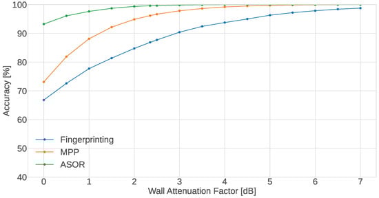 Lastly, the results for the path loss exponent, shown in Figure 8, show that the ASOR multi-sensor method is nearly invariant to changes in the path loss exponent while the accuracies of the MPP and single-sensor methods both increase slightly with the exponent. Since the path loss exponent is the factor that is most likely to change between buildings—even if the walls are made of the same material, changing the size of the rooms would impact the path loss exponent—being invariant to its changes is a desirable trait for localisation methods. It means that the same level of performance can be expected in most environments. The reason why the two methods are affected slightly by the exponent is due to the interaction in the RSSI model between the distance and wall attenuation. The logarithmic form of the model means that an increase in distance will affect the resulting RSSI value differently depending on the initial distance. This can be seen in Figure 4, where the model stagnates after some distance–at a small initial distance the change in distance results in a large change in RSSI and at a larger initial distance, the change in RSSI is small. By changing the path loss exponent we change when this stagnation point is, i.e., larger exponent values move the stagnation point to larger initial distances. What this means for the localisation is that when the exponent is small, there will be less separation between the RSSI values recorded at the different CTUs due to the particular room sizes in the building plan. This results in less meaningful information for the MSE calculations, which makes the methods more prone to failure. The reason why the ASOR method is not affected is likely due to the fact that the loss in information only affects a fraction of positions in each room where a sensor is more likely to be estimated in a neighbouring room. As such, the majority of sensors will still be estimated in the correct room and the few errors are corrected.