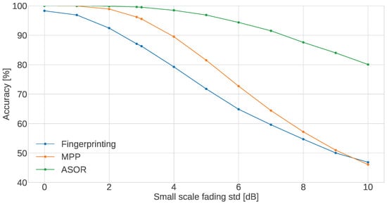 For the standard deviation (std) of the noise, the performance of the proposed methods, shown in Figure 7, also behaves as expected, where the accuracy of all methods decreases as the noise increases. However, even where there is no noise at all, the single-sensor method does not achieve 100% accuracy. This means that even without any distortion to the RSSI values, the attenuation caused by the walls of 2.35 dB is not high enough to overcome the difference in distance between the sensor and the two closest CTUs (the CTU in the same room as the sensor and the CTU in the adjacent room) when the sensor is up against the wall.