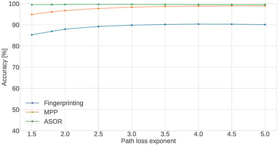 Accuracy of the proposed methods as a function of the path loss exponent .