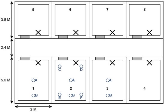 Overview of sensor locations for the real-world validation test. The building plan follows the same layout as the one used in the RSSI model fitting measurement campaign. The circles indicate the locations of sensors, and the letters and numbers are used as identifiers for each sensor (the number identifies which room the sensor is in, and the letters distinguish the position of a sensor in a room). The Xs indicate the locations of the CTUs in each room.