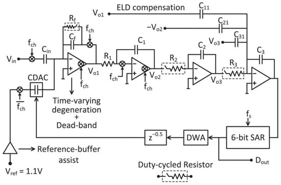 Figure 21 shows the circuit diagram of the proposed second-order ΔΣ ADC. The proposed ADC is a first-order input feedforward structure. The loop filter consists of an SC integrator. The main idea is to apply a filtered gain stage to reduce the effect of kT/C input-referred noise caused by the loop filter. The filtered gain stage consists of a CFIA and an active lossy integrator to achieve low input-referred noise and high DC gain. The CFIA includes a chopping technique, which allows DC input signals and eliminates flicker noise and DC offset. The active lossy integrator suppresses high-frequency signals with high amplitude and provides high DC gain. By the high gain of the filtered gain stage, the value of the input capacitor of the SC integrator to achieve the target performance is significantly relaxed. The multi-bit quantizer and three-input adder are implemented with a linear VCO-FDSM. The linear VCO has three input SC circuits for the adder function. The output of VCO-FDSM is a 30-bit thermometer code, equivalent to a 5-bit binary code.