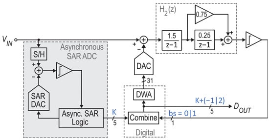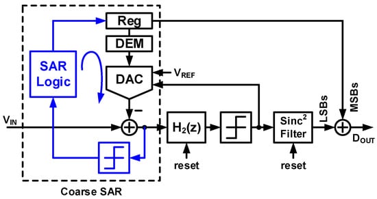 Figure 2 shows the architecture of the high-resolution incremental zoom ADC []. This zoom ADC operation is a two-step, coarse, and fine conversion. This ADC is a hybrid structure that combines the successive approximation register (SAR) ADC and the ΔΣ ADC. The SAR ADC is a power-efficient ADC, and the ΔΣ ADC is an oversampling and noise-shaping ADC for high resolution. The SAR ADC and ΔΣ ADC are operated for coarse and fine conversion, respectively. The coarse conversion is processed in the SAR ADC, and the output is the most significant bits (MSB) of the overall digital output. The ΔΣ ADC uses the output of the SAR ADC as the reference voltage for fine conversion. As a result, this architecture functions as a multi-bit ΔΣ ADC that uses the SAR ADC as a multi-bit quantizer. The SAR ADC has a 6-bit resolution, and the ΔΣ ADC has a 1-bit stream output. The ΔΣ ADC uses the reference voltage as the two least significant bits (LSB) with an over-ranging technique. This over-ranging mitigates the requirements of the SAR ADC. Consequently, the SAR ADC functions as a 5-bit quantizer for the ΔΣ ADC, and the overall architecture becomes a 5-bit ΔΣ ADC. The DT ΔΣ ADC has two primary noise sources, namely the quantization noise and the KT/C noise. First, to achieve an SQNR of over 120 dB, this architecture requires an OSR of 256 with a second-order loop filter and a 5-bit quantizer. The KT/C noise is not shaped by the loop filter, while the loop filter shapes the quantization noise. Thus, to obtain an SNR of 120 dB, a higher OSR than the OSR for the target SQNR is necessary. The proposed ADC in this paper employs an OSR of 2000 and a sampling capacitor of 10.2 pF to achieve a high SNR above 120 dB. The incremental-zoom ADC is designed with a 6-bit SAR ADC and a 1-bit ΔΣ ADC that have a second-order loop filter, a sampling capacitor of 10.2 pF, and an OSR of 2000. This ADC achieves a 20-bit resolution with a power consumption of 6.3 μW. However, the sequential operation of the coarse and fine conversions makes the ADC slow and limits the bandwidth to DC.