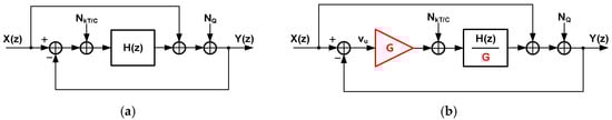 Figure 4b depicts the ∆Σ ADC employing a gain stage. The gain stage is located before the loop filter. The loop-filter transfer function is H(z)/G to maintain the overall transfer function. The transfer function of an ∆Σ ADC employing the gain stage is expressed as Equations (3) and (4). Gain reduces the NkT/C in Equation (3). The G2 will reduce the kT/C noise power.