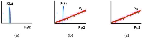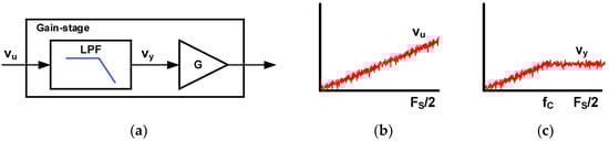(b) For the filtered gain stage, since the input of the gain stage is quantization noise, an input magnitude depends on the number of bits of the quantizer. Table 1 shows the relationship between quantizer bits and VLSB at a 1.2 V supply voltage. The VLSB of the 5-bit quantizer is 39 mV. In this case, if the linear output range of the gain stage is 200 mV, the gain is limited to five. The filtered gain stage is proposed to overcome this limitation. Figure 5 shows the signal spectrums of each point in Figure 4b. Figure 5a,b illustrates the input X and output Y spectrums, respectively. Figure 5c is the gain-stage input spectrum, which is the noise-shaped quantization error. As shown in Figure 5c, the maximum magnitude of quantization noise is from the high-frequency term, limiting the maximum gain of the gain stage. The gain stage with first-order LPF is shown in Figure 6a. The LPF is placed before the gain stage to reduce the high-frequency components of the quantization noise. Adding LPF provides two advantages. First, as shown in Figure 6b,c, the LPF reduces the maximum amplitude of shaped quantization noise and helps the gain stage have a large gain. The reduction ratio is equivalent to the ratio of the loop filter unity–gain frequency, FT,H(z), and the cut-off frequency, fC, of the filter. The unity-gain frequency of the loop filter is written as Equation (5), and the reduction ratio is FS/(2π∙fC). FS is the sampling frequency. The second advantage is avoiding noise aliasing. In the DT ∆Σ ADC, the sampling by the SC circuit aliases the noises outside the FS/2 []. The LPF prevents noise-aliasing since the LPF filters the white noise of the gain stage from fC.