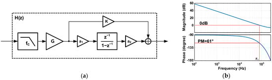 (b) For the stability of the proposed loop filter, in the loop filter with a filtered gain stage, the LPF of the filtered gain stage introduces another pole in the transfer function. This stability issue requires frequency compensation, and a feedforward path can be adopted to address this issue. The feedforward path provides a zero and restores the unity-gain frequency FT to an original loop filter of FS/2π. Figure 8a depicts the block diagram of the proposed ADC’s loop filter with a feedforward path. The open-loop transfer function of the proposed ADC is represented as HADC(z) = H(z)∙z−1, where z−1 denotes the delay in the linear VCO-FDSM. H(z) includes the gain stage, SC integrator, and feedforward path with K1. The s-domain block can be converted to z-domain using the Laplace transform in Equation (6), and α is a coefficient used to correct the DC gain. The α can be determined by evaluating H1(1) = 1.