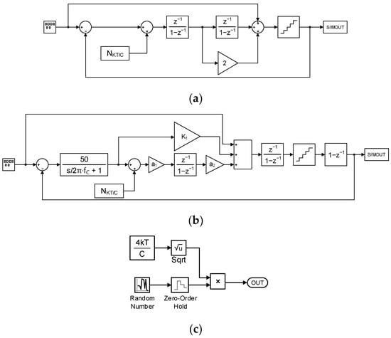 Behavioral simulation model. (a) Conventional ∆Σ ADC, (b) proposed ∆Σ ADC, and (c) kT/C noise.