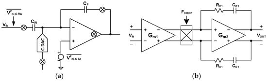 Figure 13a shows the chopping CFIA block diagram with the noise model. The CIN and CF are the input and feedback capacitors, respectively. The CFIA has the input capacitor, while the conventional inverting amplifier has the input resistor. Since the input component is a capacitor, the DAC type is C-DAC. This structure eliminates the thermal noise caused by the resistor. The gain of the CFIA is derived from Equation (10).