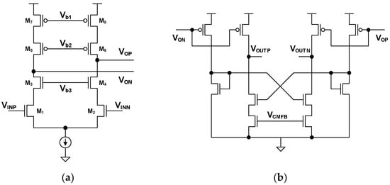 The OTA block diagram for the CFIA is shown in Figure 13b. The OTA consists of a two-stage structure. The first stage is a telescopic amplifier, and the second stage is an output buffer based on a common-source (CS) amplifier. Figure 14a,b shows the circuit details of the first and second stages, respectively. The transistor-level analysis of this is detailed in reference []. The first stage gain reduces the input-referred noise of the second stage. As a result, the noise from the first stage is dominant. The single MOSFET noise is . The k is Boltzmann’s constant, and T is the absolute temperature. The γ is the excess noise coefficient, and gm is the transconductance. The value of γ is two-thirds for the strong inversion region and one-half for the weak inversion region. The input-referred noise of the telescopic amplifier is defined by Equation (12).