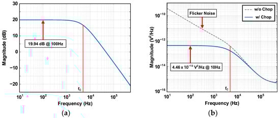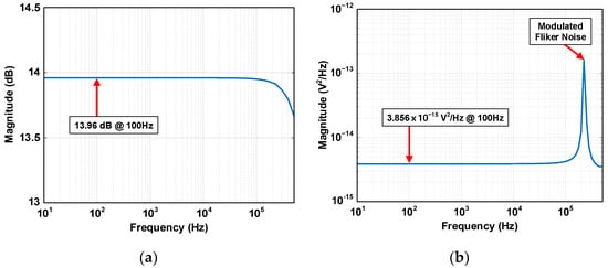 The CFIA’s input capacitor blocks a DC signal. The CFIA can process the DC signal by applying the chopping technique with the CFIA. The chopping technique also has the advantage of shifting the flicker noise of the OTA to the chopping frequency. As a result, only the thermal noise of the OTA is present in the bandwidth of interest []. The CFIA is primarily affected by thermal noise of the OTA, as shown in Figure 13a. The flicker noise of the OTA can be disregarded, since it will be shifted to the chopping frequency.