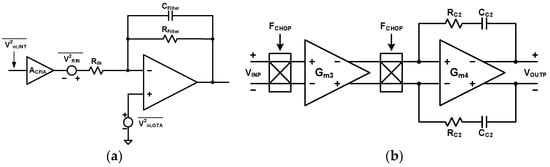 Since the CFIA has a gain limitation, the active lossy integrator in Figure 16a can be used to add extra gains []. This LPF also has thermal noise generated by an input resistor, but the CFIA gain reduces this noise. Larger resistors can be used for the same amount of noise power. This circuit’s gain and cutoff frequency are as specified in Equations (8) and (9), respectively.