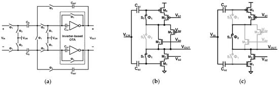 Since the SC integrator produces the output at Φ2, not Φ1, it has a half delay z−1/2. The coefficient a1 is the ratio of CS and CINT, CS/CINT. An inverter-based OTA is a desirable solution for a power-efficient circuit, and Figure 18b,c shows the circuit detail. The transistor-level analysis of this is detailed in reference []. The cascode inverter architecture provides a high DC gain. The biasing floating current source and auto-zeroing capacitor Caz are adopted for setting the operating point. In the sampling phase Φ1 in Figure 18b, the floating current source provides a bias current, and S1 and S3 connect the input and output nodes of the inverter. The shorted inverter makes the switching point according to the bias current. The DC offset caused by the voltage difference of VCM and inverter switching point is charged in the Caz. In the integration phase Φ2 in Figure 18c, S2 turns off the floating current source, and S1 and S3 disconnect the input and output nodes. The Caz compensates the inverter DC offset and sets the operating point to VCM.