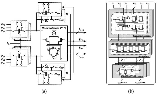 Linear VCO-FDSM [], which consists of a linear VCO and a fully digital frequency delta–sigma modulator (FDSM), is adopted as a quantizer having a first-order noise-shaping property. Figure 20a shows a detailed circuit diagram of the linear VCO with an adder. As a three-input adder, the linear VCO has the three-input SC, C1, C2, and C3. The adder has three inputs, namely input feedforward, filtered gain-stage output, and SC integrator output. The coefficient values a1 and K1, required for each input shown in Figure 11, are implemented by weighting the input capacitor ratio C1:C2:C3. The conventional VCO is based on a three-stage ring oscillator. The linear VCO-FDSM uses all three inverter outputs of the ring oscillator to realize a 5-bit quantizer. The outputs of the differential linear VCO are FP1–3 and FN1–3. The maximum output frequency of the linear VCO-FDSM is five times the sampling frequency FS.