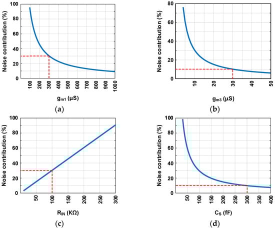 Table 3 shows the main parameters and values used in circuit implementation, as well as the simulated noise contributions of the main blocks. The primary noise sources of the proposed ADC are the CFIA and active lossy integrator. In Section 3.2 and Section 3.3, the validity of the noise analysis method is confirmed based on the hand-calculation values and transistor-level simulation results. Figure 22 plots the noise contributions according to the design parameters of each major block based on this analysis method. The parameters affecting the noise of the block CFIA, active lossy integrator, and SC integrator are gm1, RIN, and CS. Figure 22a,b are the values for OTA of CFIA and active lossy integrator, respectively. Figure 22c,d are the noise contributions for the active lossy integrator’s input resistance and the SC integrator’s input capacitor. To ensure that the block CFIA, active lossy integrator, and SC integrator each account for 30%, 30%, and 10% of the noise budget, the gm1, RIN, and CS are 300 μS, 100 kΩ, and 300 fF, respectively.