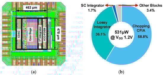 Figure 23b shows the power distribution at the 1.2V supply voltage. The proposed second-order ΔΣ ADC consumes a total power of 530.76 μW at the 1.2 V supply voltage. The chopping CFIA and lossy integrator consume 312 μW and 191.7 μW, which account for 58.8% and 36.1% of total power consumption, respectively. The power consumptions of the chopping CFIA and lossy integrator include bias circuits and common-mode feedback circuits. The SC integrator and the other blocks’ power consumptions are 9.2 μW and 17.9 μW, respectively. The other blocks contain the clock generator, linear VCO-FDSM, and CDAC with reference voltages.
