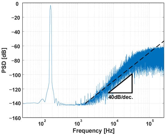 To verify the ADC performance, transient simulation was performed, and the results were converted to a spectrum in the frequency domain through FFT. The transient simulation was performed as the pre-layout circuit and included device noise generated from transistors and resistors. Figure 24 plots the proposed second-order ΔΣ ADC’s 16-average FFT power spectral density (PSD), which comes from 16 different sections in one transient simulation result. The input frequency is 200 Hz, and the input amplitude is −3 dBFS at 1.2 V supply voltage, where the maximum input amplitude is 1.2 VPP. The proposed ADC achieves the peak SNDR of 117.7 dB. The spectrum has a 40 dB/decade slope, which is a 2nd-order noise-shaping characteristic. The noise power spectral density normalized to the maximum signal power appears as a noise floor of −143 dB in the frequency domain for a 216-point FFT transformation. However, the designed ADC has a noise floor of approximately −140 dB, as shown in Figure 24. This means that the noise floor of the designed ADC differs by less than 3 dB from the target noise floor.