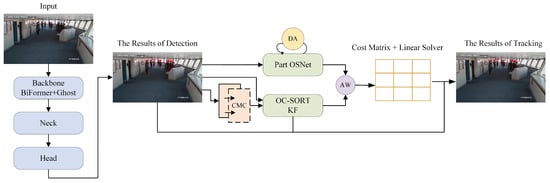 Deep learning has shown an excellent performance in both object detection and multi-object tracking, and it is the mainstream technique in this field []. Contemporary multi-object-tracking algorithms can be categorized into two groups: Tracking By Detection (TBD) and Joint Detection and Tracking (JDT) []. TBD has been a hot research topic in recent years, which is based on the principle of object detection for each frame in the video stream and then the object association between neighboring frames, i.e., tracking using the results of object detection []. JDT, on the other hand, uses the same network for the detection and embedding of appearance information, which is faster but often requires common parameters to be set for these two different tasks, and thus TBD performs better in terms of accuracy []. Typical TBD algorithms are SORT, DeepSORT, Deep OC-SORT, etc.