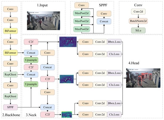 To improve detection quality in shipboard surveillance scenarios, this section addresses the issues of people onboard frequently obstructing each other, the presence of many small targets on the deck, and the requirement for the model to remain compact. The BR-YOLO algorithm is proposed, and its structure is shown in Figure 2. The algorithm retains the network structure of the Neck and Head from YOLOv8n. Instead of extensively utilizing the C2f module in the backbone network, BR-YOLO incorporates the BiFormer structure at shallow layers to enhance the feature-extraction capability while maintaining lower parameters. Additionally, improvements are made to the retained C2f module by introducing the RepGhost structure, ensuring accuracy is maintained while reducing computational complexity through reparameterization.