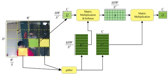 To address the aforementioned challenges, this study starts with the detector and introduces the BiFormer structure in the shallow layers of the BR-YOLO backbone network. BiFormer is a visual transformer based on sparse attention mechanisms, with its core component being bilevel routing attention (BRA) []. The key idea of BRA is to filter out most irrelevant key–value pairs at a coarse region level so that only a small portion of routed regions remain, thus removing redundant information. Then, fine-grained attention is applied within the selected routed regions’ union. BRA restricts the scope of attention calculation, thereby improving performance while reducing computational complexity. The schematic diagram of BRA is illustrated in Figure 3.
