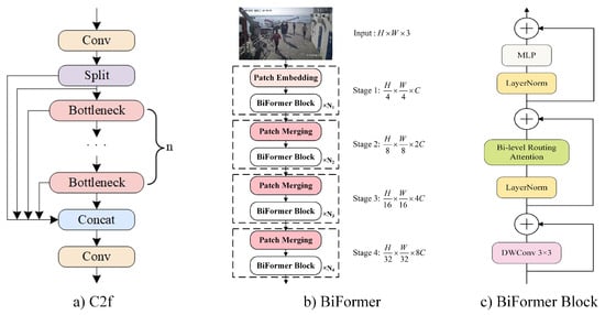 From the analysis above, it can be inferred that BiFormer, leveraging the structural characteristics of transformers, utilizes BRA for sparse sampling, replacing the downsampling of convolutional operations in convolutional neural networks (CNNs). CNNs extract features through convolutional layering, demonstrating stronger capabilities in extracting local features. However, they often lack long-distance connections for global image understanding, and downsampling operations in convolutional layers may lead to information loss. The C2f module in YOLOv8 is composed of numerous convolutional layers, embodying a typical CNN structure. For these reasons, this paper integrates the BiFormer module in the shallow layers and the C2f module in the deep layers of the BR-YOLO backbone network. Figure 4 illustrates the network architectures of BiFormer and C2f.