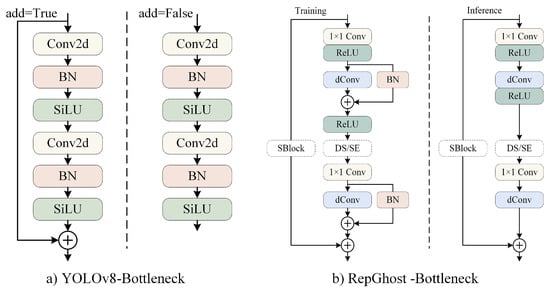 The core idea behind the RepGhost structure is to improve GhostNet through reparameterization to achieve implicit feature reuse []. GhostNet is a lightweight neural network that utilizes low-cost operations to generate a large number of feature maps, which are then concatenated with the original features to produce additional feature maps []. Concatenation operations indeed have a significant effect on reducing the model’s parameters and FLOPs. However, in practical applications, the efficiency of concatenation operations is much lower than that of addition operations, and they also incur higher computational costs on hardware []. Instead of inefficient concatenation operations, RepGhost adopts the more efficient addition operation to implicitly execute the information-fusion process, thus improving the inference speed. Another advantage of RepGhost is that the number of input channels is equal to the number of output channels during the inference stage, further saving inference time on hardware devices while maintaining the generation of different feature maps. The RepGhost Bottleneck is an improvement over the Ghost Bottleneck based on the RepGhost structure, directly replacing the Ghost module within it. The Bottleneck in YOLOv8n consists of two 3 × 3 convolution modules. Compared to the Bottleneck in YOLOv8n, structural reparameterization in the RepGhost Bottleneck reduces the inference process to just two branches, saving hardware memory costs and improving the inference speed. The structural diagrams of the two are illustrated in Figure 5. The RepGhost Bottleneck is highly concise during inference, consisting of only one direct connection module branch and a single-chain operation composed of 1 × 1 convolution, Depth-wise convolution, and ReLU. This has a significant impact on reducing model size and improving the inference speed. RepGhost Bottleneck also ensures feature fusion across different layers during training through reparameterization, maintaining the generation of different feature maps and thus preserving the feature-extraction capability of BR-YOLO.