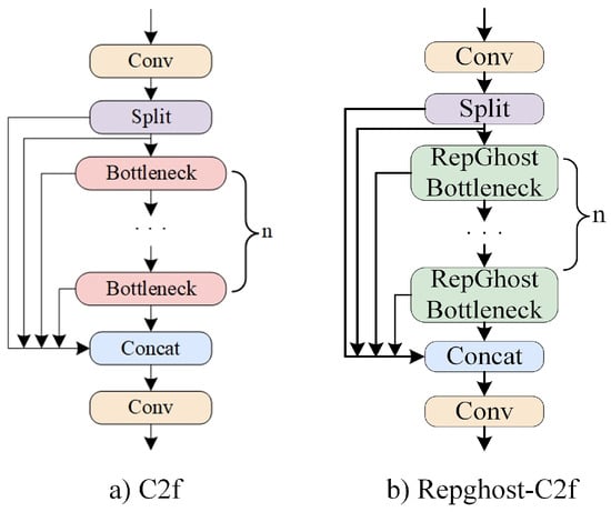 This study uses the RepGhost concept to improve the C2f module, replacing the original Bottleneck module in C2f with the RepGhost Bottleneck and naming it RepGhost-C2f. It is utilized in the deep layers of the BR-YOLO backbone network, and its structure is depicted in Figure 6. RepGhost-C2f retains the core structure of C2f but inherits the characteristics of RepGhost, such as less parameters, simplified computations, and a faster inference speed, by introducing reparameterized lightweight structures. The improvements of RepGhost-C2f on the detector volume, detector inference speed, and multi-object-tracking performance for shipboard-intrusion prevention will be validated in Section 4.4 and Section 4.5.