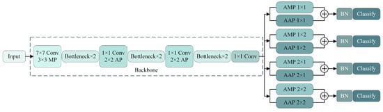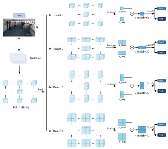 After traversing all layers of the backbone network, Part OSNet employs four branches to process full-scale features. Each branch employs adaptive max pooling and adaptive average pooling, followed by combining the pooled results. Max pooling emphasizes the most prominent local regions, while average pooling focuses on background information. Their fusion contributes to extracting a more comprehensive set of feature information. The branches differ in their use of various adaptive pooling sizes to extract distinct features. The first branch utilizes a 1 × 1 adaptive pooling size to extract features from the entire full-scale feature map. The second branch employs a 1 × 2 size to pool horizontally. The third branch uses a 2 × 1 size for vertical pooling. In the fourth branch, the full-scale features are partitioned into four grids to extract part-level features.