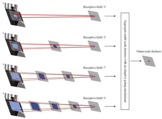 This study retains the backbone network of OSNet, keeping the structure identical to OSNet’s architecture up to the Global Average Pooling (GAP) layer. However, it removes the GAP layer and subsequent layers. The purpose of retaining the backbone network of OSNet is to preserve OSNet’s capability for full-scale feature extraction and its lightweight characteristics. OSNet learns comprehensive object-feature representations. Figure 8 illustrates the basic building block of OSNet, which consists of multiple convolutional streams with different receptive field sizes. Each stream focuses on features with scales determined by an exponentially increasing index to ensure the capture of different scales in each block. The resulting multi-scale feature maps are dynamically fused by the AG. The AG is a trainable small neural network with shared parameters among all streams, possessing many properties required for effective model training. By using a trainable AG, the generated channel weights depend on the input, enabling dynamic scale fusion.