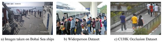 Since there is no publicly available dataset of onboard surveillance personnel on the Internet, this study obtains the shipboard surveillance data of the Bohai Sea Ro-Ro Ship and preprocesses these data to construct the dataset independently. The Bohai Sea Ro-Ro Ship Dataset was collected from real shipboard surveillance videos, where personnel trajectories are more complex and the space is more confined than in traffic scenarios. This makes it a more effective dataset for fully validating the algorithm proposed in this paper. In order to ensure the diversity of the object-detection dataset, the surveillance video is divided into two parts. In the first part, the cropped video clips are labeled using DarkLabel 2.4 with every 20 frames sampled and added to the object-detection dataset. The remaining surveillance video segments are used to validate the multi-object-tracking algorithm. In addition, due to the limited number of shipboard surveillance videos and the lack of personnel richness, this study, in order to enhance the robustness of the object-detection model and improve the model feature-extraction capability, adds the traffic scene pedestrian dataset, CUHK Occlusion Dataset, and WiderPerson Dataset to the dataset, as shown in Figure 10. Among them, the CUHK Occlusion Dataset is the mainstream pedestrian-detection dataset, shot on the campus of CUHK, with rich pedestrian features and diverse pedestrian situations, including occlusion and re-identification. The WiderPerson Dataset is a dense-crowd dataset with a large number of people overlapping and with diverse appearances, which is no longer confined to the traffic scenario and enriches the background, which can make up for the lack of diversity in the shipboard surveillance and the lack of diversity in traffic scenarios. These three parts together constitute the shipboard pedestrian object-detection dataset, which contains 10,678 images, and is divided into the training set (8542 images), the validation set (1068 images), and the test set (1068 images) according to the ratio of 8:1:1. It uses Labelimg for annotation, and the pedestrian class is named as 0.