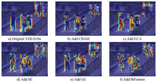 For the purpose of validating the effectiveness of BiFormer, this study incorporated four additional attention mechanisms into the backbone network for comparison. The results are shown in Table 5. From Table 5, it can be observed that BiFormer achieves the highest increase in accuracy with the least parameter increments. This is due to the fact that BiFormer achieves sparse attention through a two-layer routing mechanism, which enables the model to focus more on relevant channel information. A visual comparison of the experimental results using the Grad-CAM method, as depicted in Figure 11, reveals that models employing BiFormer exhibit more accurate coverage of all pedestrian targets with their Grad-CAM masks, indicating a more precise focus. In other words, the BiFormer module can better capture target-related features, thereby enhancing the detection performance.