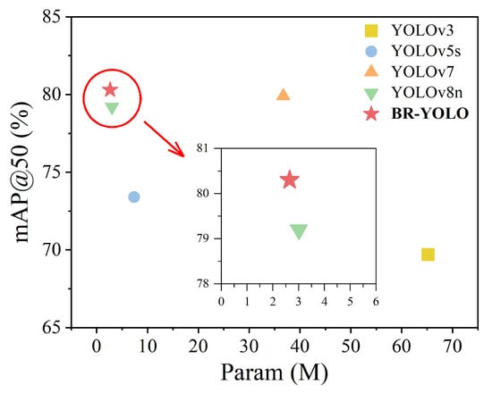 As shown in Table 7, Experiment 1 presents the training results of the original YOLOv8n, serving as the baseline for this study. Experiment 2 applies BiFormer within YOLOv8n, resulting in a noticeable enhancement in accuracy compared to Experiment 1. Specifically, precision, mAP0.5, and mAP0.95 increased by 1.2, 1.3, and 1.2 percentage points, respectively, albeit with increases in the parameters and detection time. In Experiment 3, RepGhost-C2f is employed within YOLOv8n, resulting in a significant reduction in the parameters and a notable improvement in the detection speed with minimal impact on accuracy. Experiment 4 introduces BR-YOLO, as proposed in this study. Compared to the original model, BR-YOLO demonstrates a reduction in the parameters of approximately 12%. While maintaining the same speed, it significantly enhances the detection accuracy, with increases of 0.7, 1.1, and 1.2 percentage points in the precision, mAP0.5, and mAP0.5:0.95, respectively. Thus, the shallow BiFormer block and the RepGhost-C2f block proposed play crucial roles in both improving the object-detection performance and lightweighting the model.