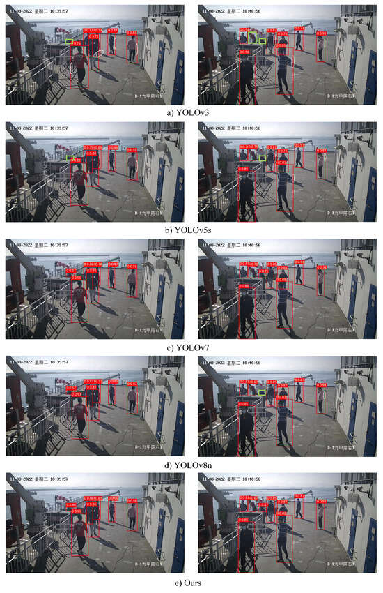 In summary, the model proposed exhibits the highest precision, mAP0.5, and mAP0.5:0.95 among the four models, along with the least parameters and shortest detection time. These results indicate that the improved YOLOv8 model proposed possesses certain advantages in accurately identifying pedestrians in maritime scenarios.