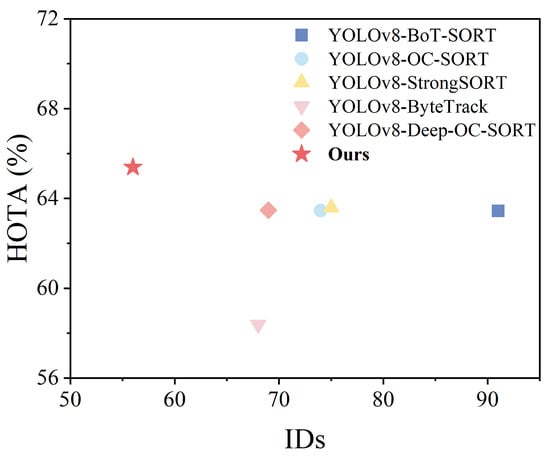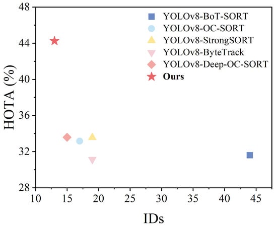 The HOTA introduces higher-dimensional tracking-accuracy metrics, offering a more comprehensive and evenly balanced assessment of the multi-object-tracking performance. The MOTA measures a tracker’s performance in both detecting targets and maintaining tracking. The MOTP gauges the localization precision of the detector. IDF1 assesses the stability of the tracker: higher values indicate that the algorithm can track targets more accurately and for longer durations.