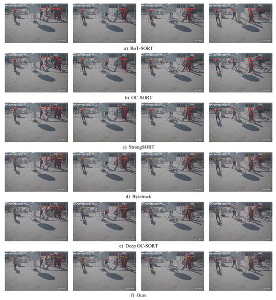 This subsection verifies the effectiveness of the multi-object-tracking algorithm proposed by comparing the current mainstream tracking algorithms. The compared algorithms include BoT-SORT [], OC-SORT, StrongSORT [], ByteTrack [], and Deep OC-SORT. In the experiments of this subsection, the detectors employed by each group of algorithms use BR-YOLO proposed above, and the Re-ID networks used in the trackers are the original OSNet. Ours is the multi-object-tracking algorithm proposed in Section 3 of this study.