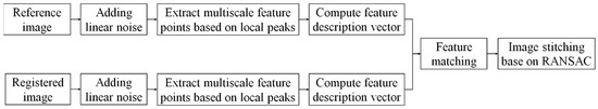 In the following exemplified case, the two images (Figure 2a) designated for stitching are referred to as the reference image (stored as the reference matrix ) and registered image (stored as the registration matrix ). Since the feature points adopted in LP-SIFT are the local peak points (both maximum and minimum), to avoid the difficulty of locating them in the constant image intensity region, e.g., due to saturation, it is numerically meaningful to first impose a small linear background on both images. Therefore, the new image matrixes becomes