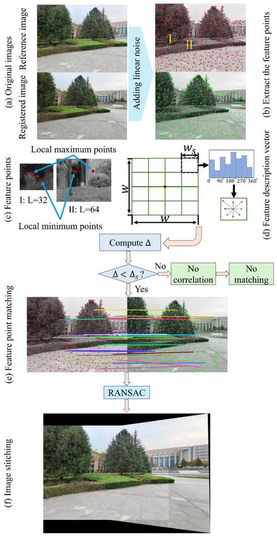 Various image stitching techniques can be traced back to the late 1970s or early 1980s [27,28,29], aiming to merge multiple images to achieve a wider field of view. In these early stages, multiple images of the same scene were simply superimposed [1]. At present, advanced image stitching techniques can be primarily categorized into two categories: region-based and feature-based [28]. In comparison to the computationally intensive region-based stitching techniques [13], feature-based techniques impose fewer requirements on region overlapping [30], rendering them increasingly appealing in recent years. Harris et al. [31] initially proposed a feature-based stitching technique for detecting features in images based on corner points. Subsequently, Lowe et al. [32] introduced the scale-invariant feature transform (SIFT) approach for feature detection, utilizing the Gaussian pyramid and Gaussian difference pyramid. Although SIFT has a series of features, such as robustness, scale invariance, and rotation invariance, it necessitates substantial computational resources, leading to a slower feature point detection and accordingly, lower stitching speed.