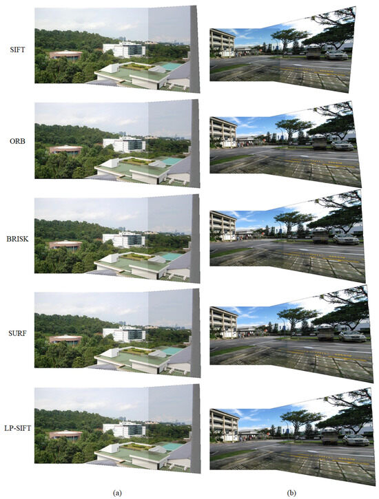 Stitching results of mountain dataset and street dataset. (a) Mountain dataset stitched by SIFT, ORB, BRISK, SURF, and LP-SIFT, respectively. In LP-SIFT, L = [32, 40]. (b) Street view dataset stitched by SIFT, ORB, BRISK, SURF, and LP-SIFT, respectively. In LP-SIFT, L = [32, 40].