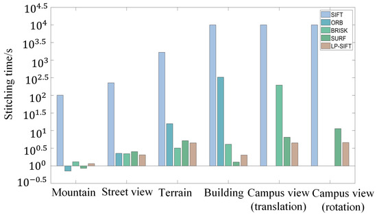 For the mountain dataset, the computation times are 101.21 s for SIFT, 0.71 s for ORB, 1.30 s for BRISK, 0.85 s for SURF, and 1.16 s for LP-SIFT. ORB takes the least time, while SIFT takes the most time. The comparison is clearer in Figure 5. However, for the street view dataset, the computation times are 226.62 s for SIFT, 2.27 s for ORB, 2.22 s for BRISK, 2.54 s for SURF, and 2.05 s for LP-SIFT. LP-SIFT takes the least time, while SIFT takes the most time. Furthermore, the stitching outcomes produced by the SIFT algorithm exhibit notable misalignment at the seams, whereas the other algorithms maintain alignment without noticeable discrepancies. In summary, SIFT is the most computationally intensive, with occasional misalignment in stitching results, while the stitching time of LP-SIFT, ORB, BRISK, and SURF are on the same level.