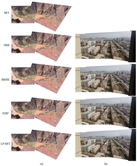 Stitching results of terrain dataset and building dataset. (a) Terrain dataset stitched by SIFT, ORB, BRISK, SURF, and LP-SIFT respectively. In LP-SIFT, L = [32,64]. (b) Building dataset stitched by ORB, BRISK, SURF, and LP-SIFT respectively. In LP-SIFT, L = [100,128].