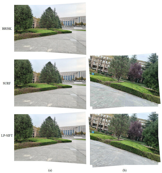 The SIFT algorithm has rotation invariance. In this section, we hope to demonstrate that the LP-SIFT algorithm also reserves the rotation invariance feature. The image pairs in the campus view (rotation) datasets with a large size of 3072 × 4096 pixels are applied. The image pairs are captured separately by the same camera, and are not artificially rotated from each other. SIFT, ORB, BRISK, SURF, and LP-SIFT algorithms were employed to detect feature points and feature description vectors. The RANSAC algorithm is further used to stitch the images. Figure 7b depicts the stitching results achieved by combining the SURF and LP-SIFT feature point detection algorithms with RANSAC, along with the stitching parameters summarized in Table 2. It is evident that both feature point detection algorithms can successfully stitch the two images. Relative to SURF, the LP-SIFT algorithm provides a better stitching effect according to the higher evaluation metrics, in addition to a shorter stitching time. The SURF algorithm takes 11.42 s, while the LP-SIFT algorithm takes 4.58 s, which is only 40% of the computation time of SURF. Similar to the results seen in Section 3.4, the SIFT algorithm requires an unacceptably long time for stitching, while the ORB and BRISK algorithms fail in stitching due to the overflow of memory. Therefore, LP-SIFT shows the capability of stitching images with rotational displacements, and is particularly fast for images with a large size.