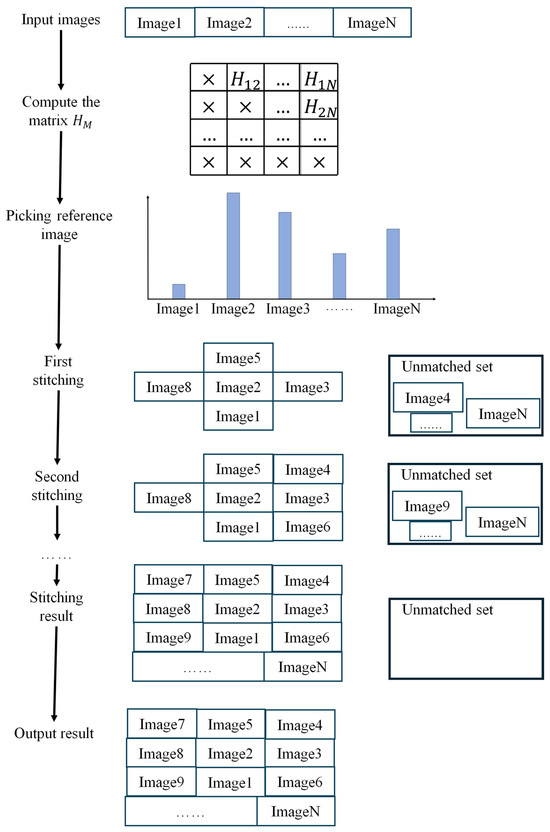 As illustrated in Figure 8, the first step involves using LP-SIFT to compute the homography matrix between each pair of images within a given dataset, which is stored in the matrix (). This aims to find the transformation relationship between individual image pairs. The process can be parallelized using CPU computing to save computation time.