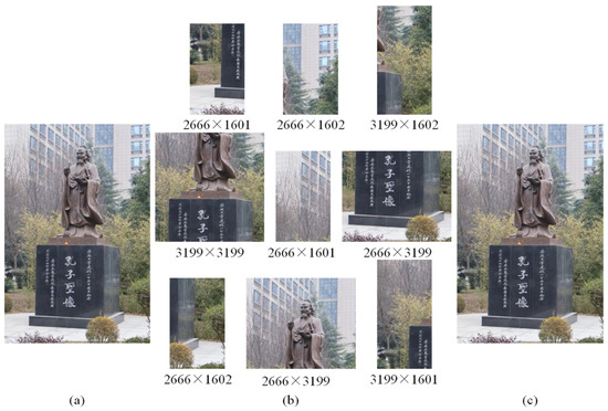 Mosaic of multiple images by LP-SIFT without prior knowledge, where L = [512,1024]. (a) Original image; the image size is 6400 × 4270. (b) The original image is stitched into different sizes and its position is shuffled, and its size is marked below the image. (c) Stitching result, and the stitching time is 158.94 s.