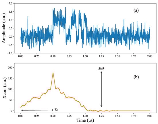 As an example, we show a numerically generated example of an RMCW time domain signal converted to the correlation domain; we generated a Barker-13 code and delayed it by 0.5 μs in an acquisition window of 2.0 μs. We included additive gaussian white noise (AWGN) to introduce noise to the received signal, as shown in Figure 1a. After correlating with the ideal reference Barker-13 sequence, we obtain a correlation signal in Figure 1b, where the correlation peak corresponds to the time delay from the return signal, . The distance to the target is then simply